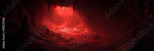© Tida, Fototapeta premium Eerie Red Cave with Glowing Light - A mysterious cave illuminated by a bright red glow, symbolizing danger, mystery, and hidden secrets. The jagged rock formations and the dark shadows create a sense