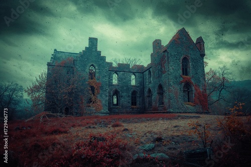 © AkuAku, Fototapeta premium Eerie remnants of an ancient fortress nestled in rural lands
