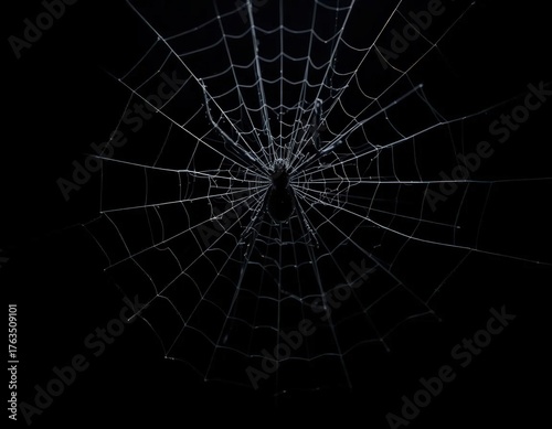 © IhsanKL, Obraz premium Eerie Spiderweb and Black Spider on Dark Background for Halloween Design Mockup