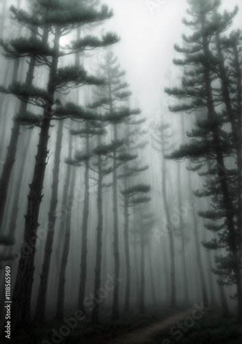 © Olivia, Fototapeta premium Eerie trees lined up straight on a clean, ordered path with liminal vibes
