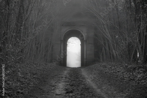 © KhondokerRajib, Fototapeta premium Eerie tunnel entrance bathed in bright mysterious light amidst dark forest