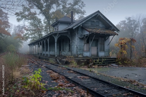 Naklejka premium Eerie view of a derelict train station and old tracks enveloped by fog in a...
