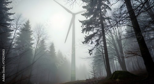 Naklejka premium Eerie wind turbine rises through misty forest creating renewable energy in a...