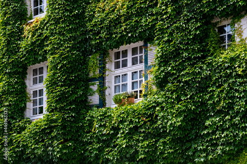 Fototapeta premium Efeu Fassade Bewuchs Deutschland Essen Margaretenhöhe Ranken Fenster Fensterläden historisch Bauwerk Denkmal alt Wohnung Idyll Nostalgie Vintage romantisch Attraktion Sehenswürdigkeit Ruhrgebiet
