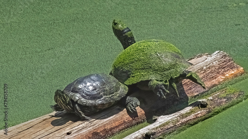 Obraz premium Effects of climate change on a pair of Red Eared Slider Turtle Terrapins (Trachemys scripta elegans) covered in a cyanobacteria algal bloom scum in warm pond waters. Long Island, New York, USA