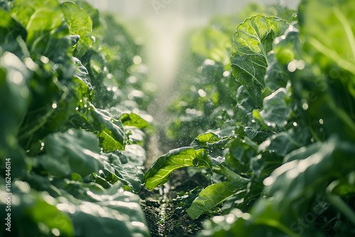 © New Robot, Fototapeta premium Efficient Drip Irrigation System Hydrating Neatly Aligned Vegetable Garden Rows