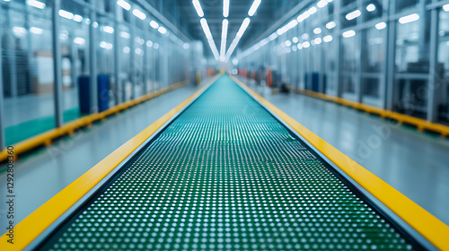 © Poonnoi, Fototapeta premium Efficient electronics manufacturing process high-tech facility conveyor belt system modern industrial environment wide-angle view production workflow