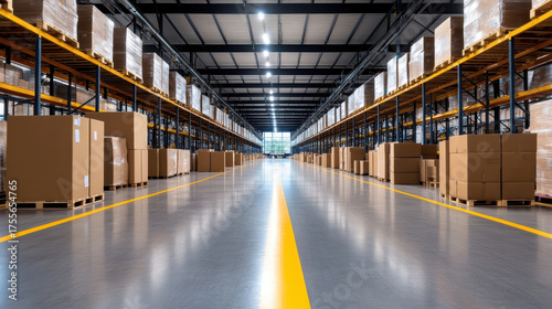 Obraz premium Efficient smart warehouse with organized boxes and bright lighting creating productive atmosphere