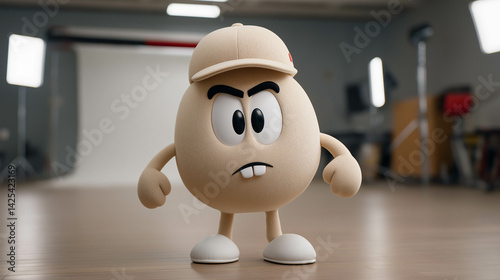 © Chainat, Obraz premium Egg Character with Angry Expression: A cute egg-shaped character, wearing a baseball cap and displaying a grumpy expression.