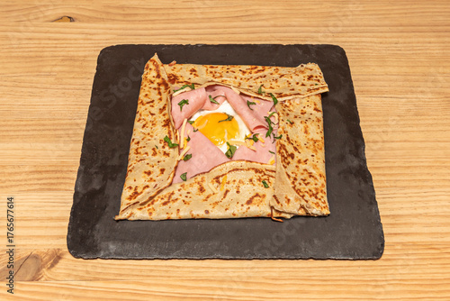 Obraz premium Egg crepes with a touch of cinnamon filled with blancmange and chopped walnuts, sprinkled with powdered sugar and accompanied by homemade cooked ham