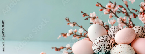 Fototapeta premium Eggs and blossoms on blue background. Happy Easter. Spring holidays and greeting card concept. Decorative composition for design, advertising, banner with copy space.