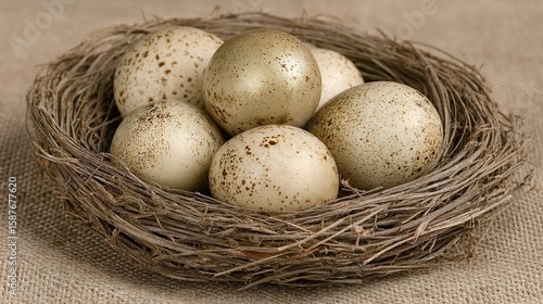 © Achaa, Obraz premium Eggs nestled within a rustic bird's nest.