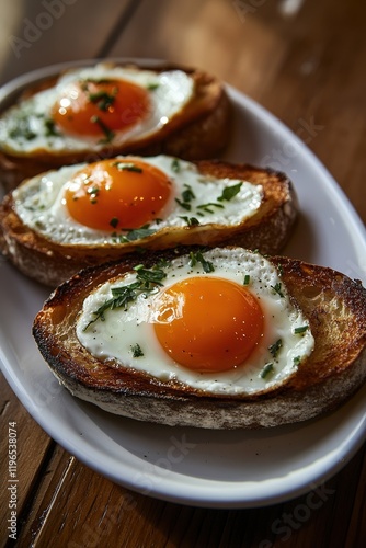 © felix_brönnimann, Fototapeta premium Eggs on toast served in a white dish, showcasing a delicious breakfast or brunch option, garnished with herbs, perfect for food photography and culinary inspiration.