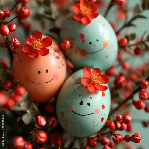 © shelbys, Obraz premium Eggs with faces - decorated with red flowers - happy and grinning
