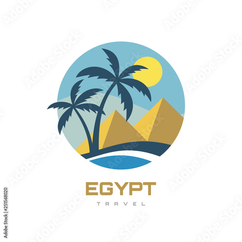 © serkorkin, Naklejka premium Egypt - landscape with pyramids. Summer holiday concept business logo vector illustration in flat style. Tropical paradise creative badge. Palms, island, beach, sea wave. Travel webbanner or poster.
