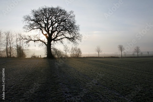 © Lars Gieger, Fototapeta premium Eiche im Winter im Morgendunst auf einem Acker in Schleswig-Holstein