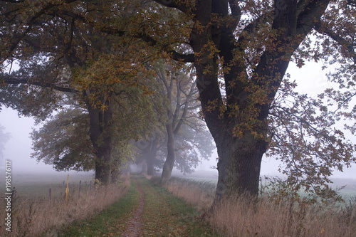 Fototapeta premium Eichenallee im morgendlichen Nebel