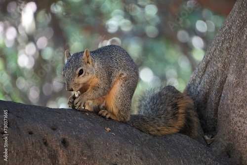 Fototapeta premium Eichhörnchen mit Nuss sitzt auf einem Ast