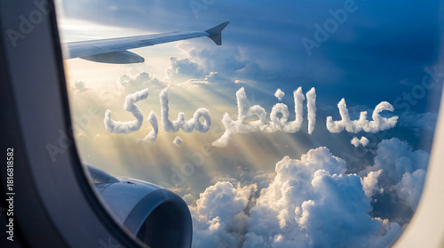 © Grafigator, Obraz premium Eid al-Fitr Mubarak Cloud Calligraphy View from Airplane Window