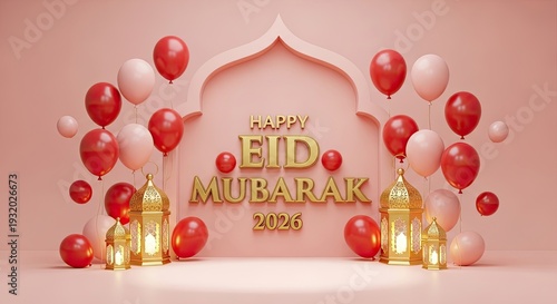 © samad, Obraz premium Eid mubarak wishes greetings islamic celebration background with balloons