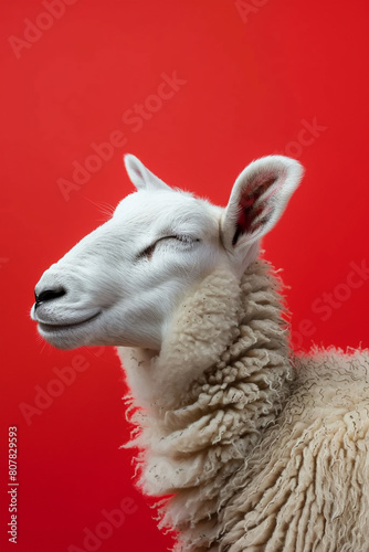 © MASmaker, Fototapeta premium Eid ul adha concept, A white sheep with its eyes closed and head raised, exuding relaxation against a red background