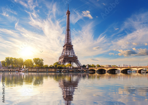 © AlexAnton, Fototapeta premium Eiffel Tower and the bridge with reflection in Seine river, Paris, France
