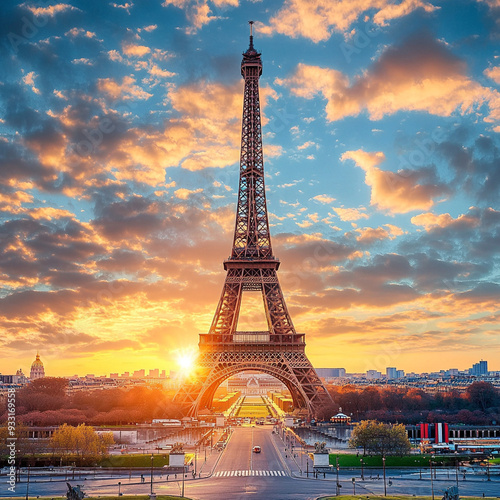 Naklejka premium Eiffel Tower at dawn, French Tower at sunset, romance.