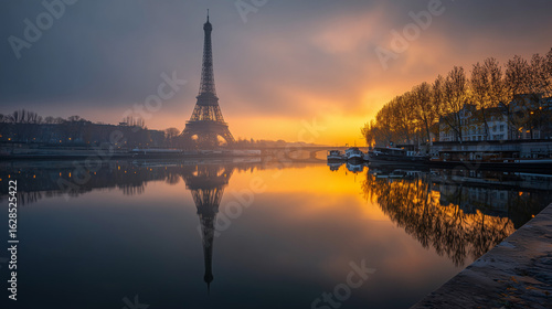 © Sherli Sintia Dewi, Naklejka premium Eiffel Tower at sunrise with light fog and river reflections