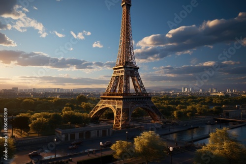 Naklejka premium Eiffel Tower at sunset in Paris France Romantic Travel background, generative IA