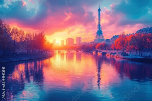 © talkative.studio, Obraz premium Eiffel Tower at Sunset Reflected in the Seine River