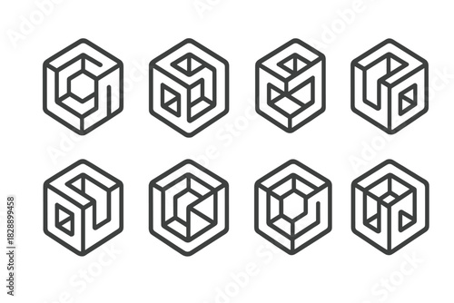 Obraz premium Eight abstract geometric cube symbols for technology and data security concepts