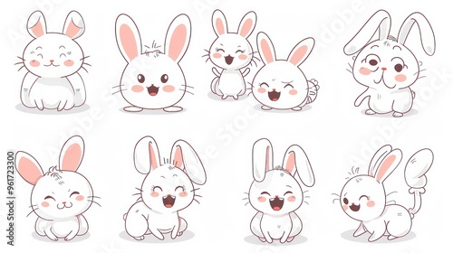Obraz premium Eight cute cartoon bunnies in various poses.