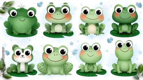 © bajita111122, Fototapeta premium Eight cute cartoon frogs with big eyes sit on lily pads, surrounded by leaves and blue butterflies, against a white background.