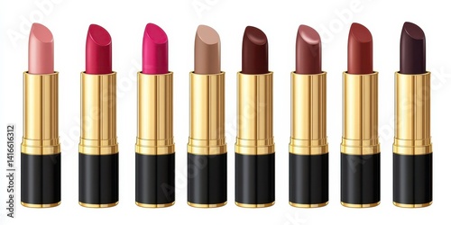 Fototapeta premium Eight Lipstick Shades in Gold and Black Tubes on White Background