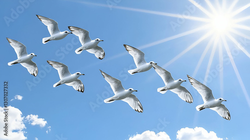 Obraz premium Eight seagulls flying in formation, sunny sky, clouds, freedom concept,...