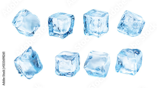 Fototapeta premium Eight transparent blue ice cubes are scattered randomly, offering cooling...