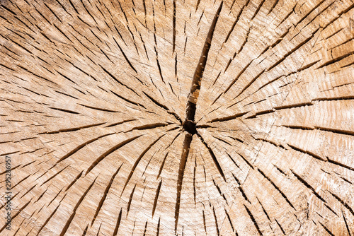 Fototapeta premium Ein abgesägter Baumstamm mit schöner Maserung und Jahresringen als Hintergrund