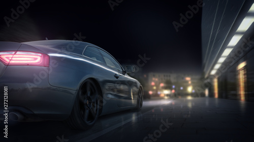 © Ron, Fototapeta premium Ein Auto fährt in der Nacht durch die Stadt.