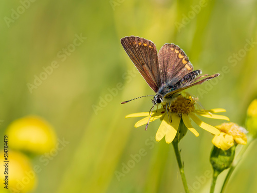 © biggi62, Obraz premium Ein brauner Schmetterling auf einer gelben Blüte