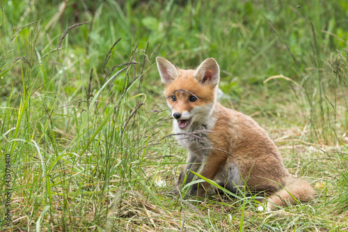 © Ronald Rampsch, Fototapeta premium Ein Fuchswelpe sitzt in der Nähe des Fuchsbaues