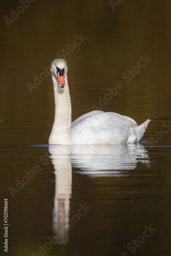 Fototapeta premium Ein Höckerschwan spiegelt sich im Wasser