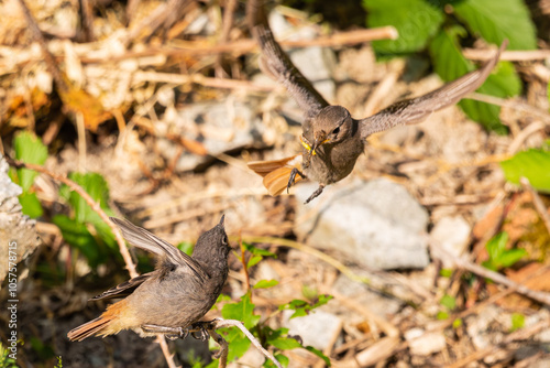 Fototapeta premium Ein Hausrotschwanz füttert ein Jungtier