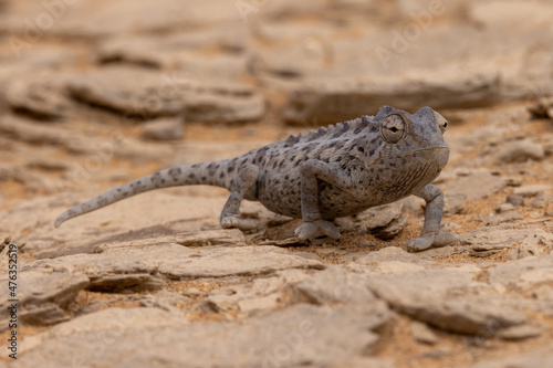 Naklejka premium Ein hell gefärbtes Wüstenchamäleon läuft über festgebackene Sandplatten