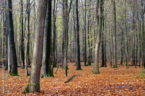 © Erik, Fototapeta premium Ein Herbstwald mit vielen Blättern auf dem Boden