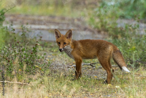Obraz premium Ein junger Fuchs beobachtet vorsichtig seine Umgebung