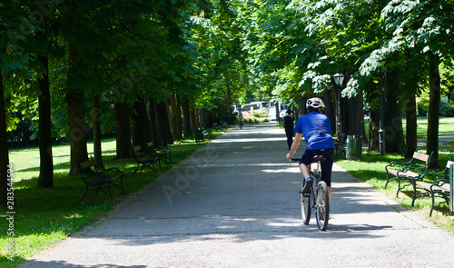 © Richtsteiger, Obraz premium Ein junger Radfahrer fährt durch einen schönen Park