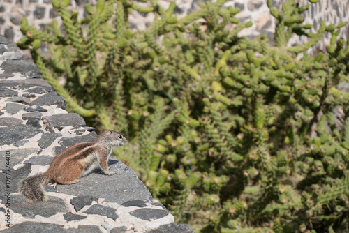 © Janet Worg, Obraz premium Ein kleines Streifenhörnchen sitzt auf einer Mauer