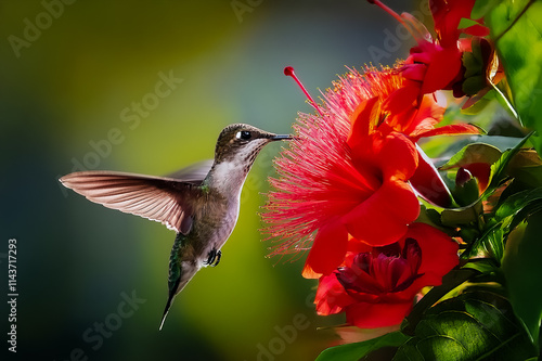 © biggi62, Fototapeta premium Ein Kolibri ist mit seinem langen Schnabel in einer Blüte