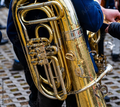 © Milan, Fototapeta premium Ein Musiker trägt seine Tuba in der Pause