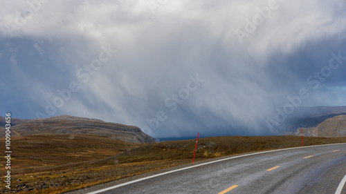 Fototapeta premium Ein Regenschauer an der Straße auf dem Weg zum Nordkapp